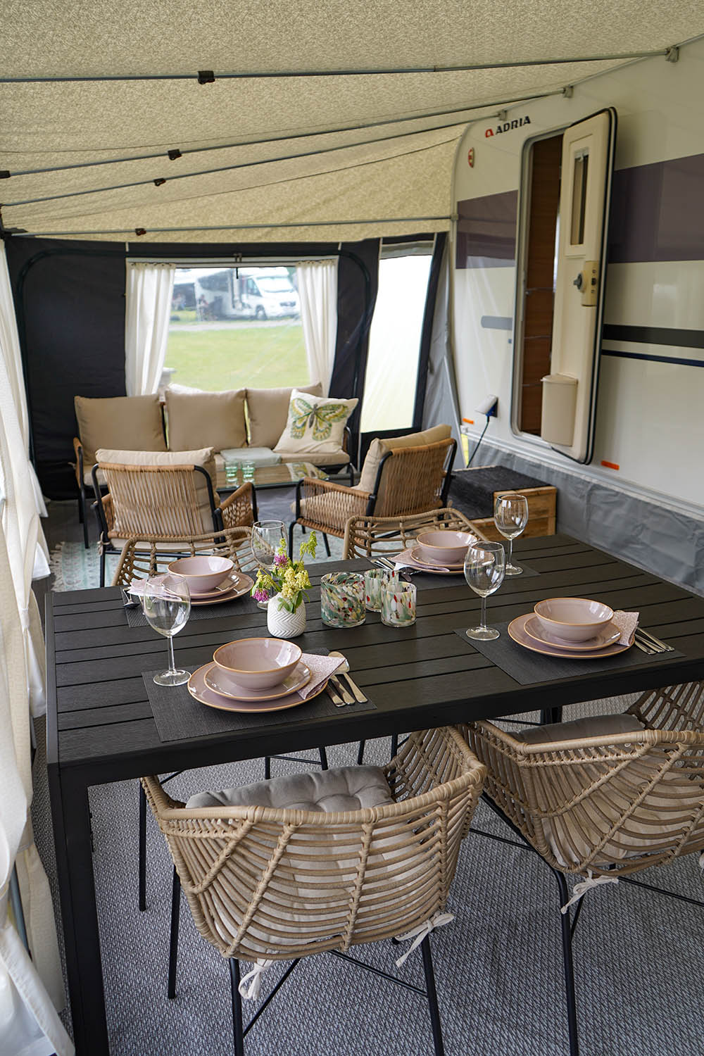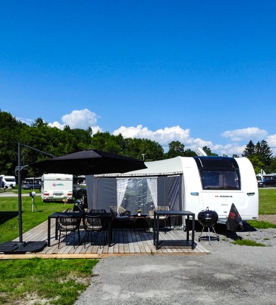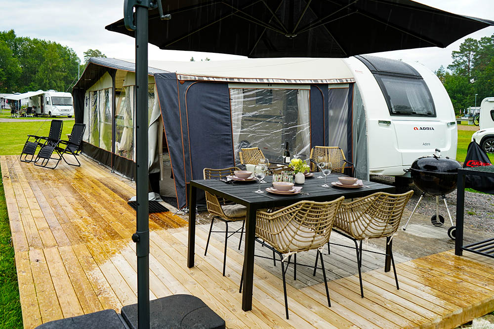 Experience glamping by Lake Mälaren! Our Glampis is a fully equipped Adria Adora 673 PK caravan with a spacious 7x3 metre Isabella awning. Perfect if you want the comfort of a hotel combined with closeness to nature and the camping feeling.